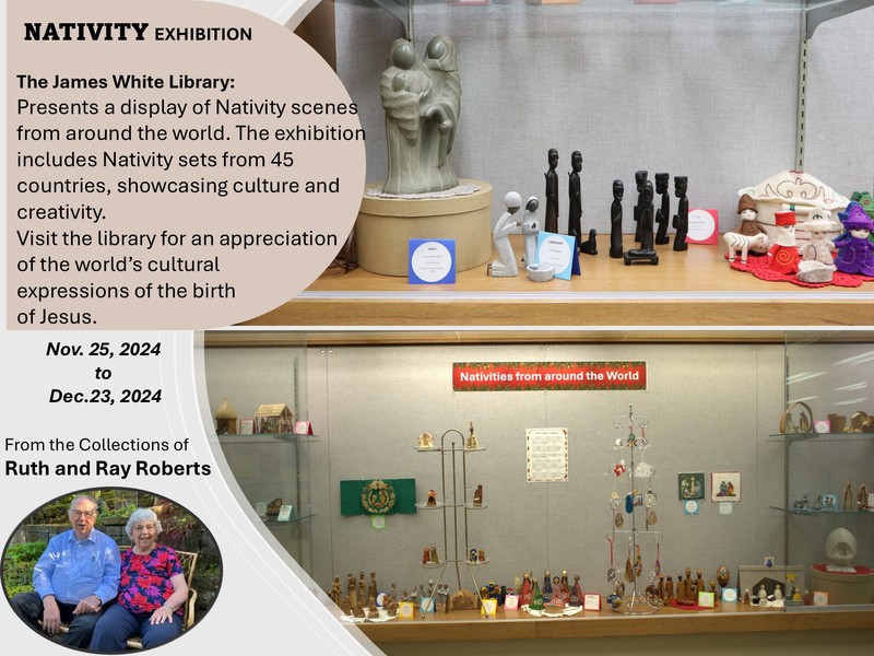 The James White Library presents a display of nativity scenes from around the world. The exhibition includes nativity sets from 45 countries, showcasing culture and creativity.