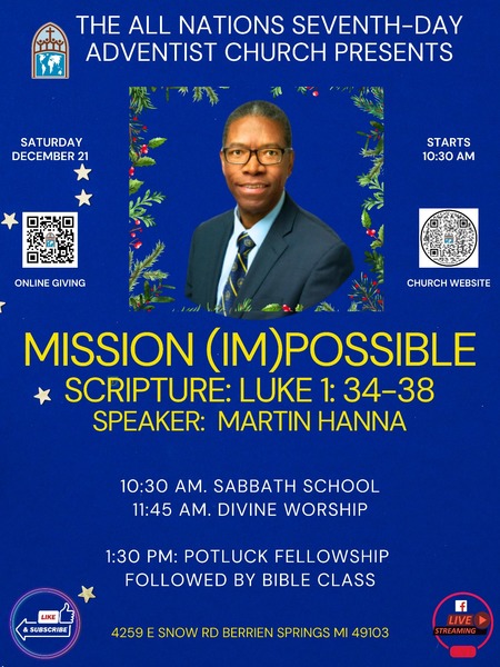 Join us for our worship experience this Saturday, December 21 @ 11:45 am as our children sing and Martin Hanna presents "Mission (Im)possible." Adult and Children's Sabbath School begins @ 10:30 am. Lunch is provided following the service. All are welcome!