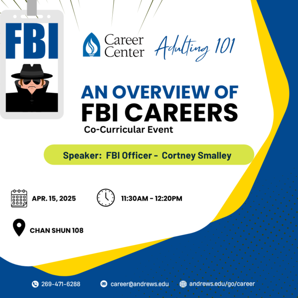 Discover the exciting career opportunities available within the Federal Bureau of Investigation (FBI) at this employer information session. Cortney Smalley, a recruiter from the FBI's Detroit Field Office, will provide an overview of the Bureau's diverse career paths, including roles in law enforcement, intelligence, cybersecurity and more. Gain insights into the FBI’s hiring process, qualifications and how to stand out as a competitive candidate. This session will take place on Tuesday, April 15, from 11:30 a.m. to 12:20 p.m. in Chan Shun Hall, Room 108. Don't miss this chance to learn about serving your community through a career with the FBI! Open to all majors. Distance learning students can participate through our hybrid option by contacting career@andrews.edu.