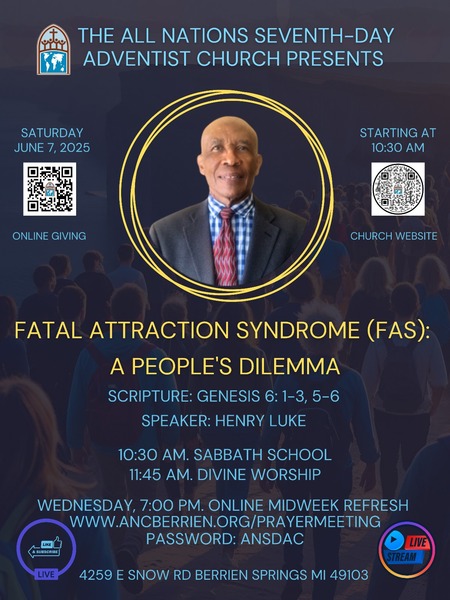 Join us for our worship experience this Sabbath, June 7, at 11:45 am, as Henry Luke presents "Fatal Attraction Syndrome (FAS): A People's Dilemma." Adult and Children's Sabbath School begins @ 10:30 am. We look forward to seeing you there!