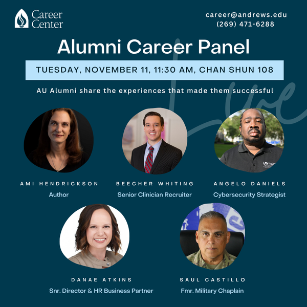 Join us for this candid conversation where prominent Andrews alumni will share the experiences and choices that helped them launch successful careers and reflect on what they might have done differently if they could go back. Come with questions and leave with advice that that you can actually use!