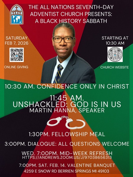 Join us for our worship experience at the All Nations SDA Church this Saturday, February 7, at 11:45 am, as Martin Hanna speaks on "Unshackled: God is in Us." Adult and Children's Sabbath School begins at 10:30 am. We will have our fellowship luncheon after the service. See you there!