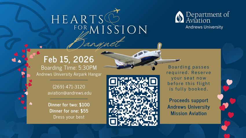 Andrews University Department of Aviation warmly invites you to the inaugural Hearts for Mission Banquet, an elegant and purpose‑filled evening dedicated to inspiring, celebrating and advancing the work of Adventist mission aviation around the world.