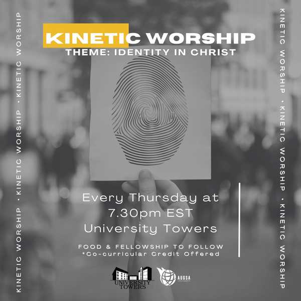 Theme: Identity in Christ Find community as you enjoy God's presence, amazing music and delicious food at Kinetic Worship every Thursday night at the University Towers Auditorium from 7:30–8:30 p.m.! Cocurricular credit offered! ... read more