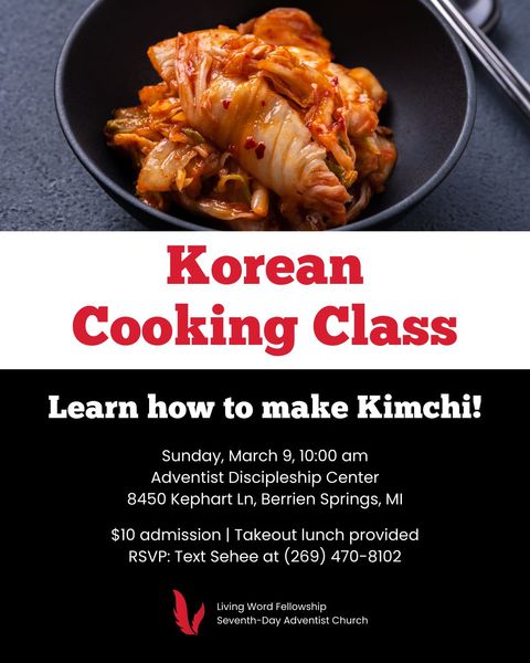 Learn how to make Kimchi! Sunday, March 9, 2025, at 10 a.m. Adventist Discipleship Center: 8450 Kephart Ln, Berrien Springs, MI $10 admission ... read more