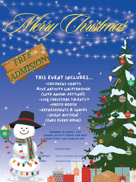 Come experience a celebration of Christ's birth from 3–6 p.m. on Sunday, Dec. 15, at the Student Activity Center in downtown Eau Claire, located at 6295 West Main Street, Eau Claire, MI. The event features a free live... read moreChristmas Eve Concert