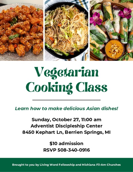 Vegetarian Cooking Class. Learn how to make delicious Asian dishes! Sunday, Oct. 27, 2024, at 11 a.m. Adventist Discipleship Center 8450 Kephart Ln, Berrien Springs, MI ...