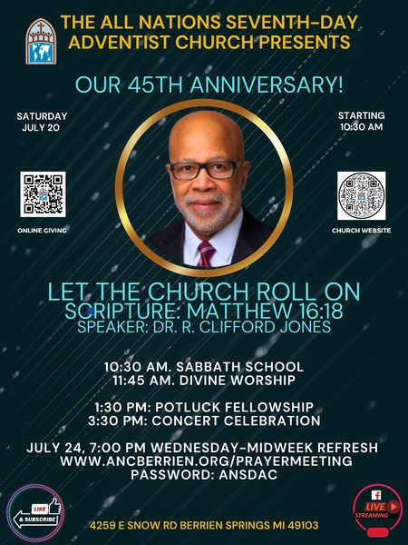 Join the All Nations Seventh-day Adventist Church for its 45th anniversary this Saturday, July 20, at 11:45 a.m., as Clifford Jones presents "Let The Church Roll On." Sabbath School begins at 10:30 a.m. Lunch is provided, followed by... read more20th Annual Health & Vegetarian Food Festival