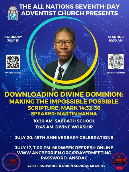 Join the All Nations Seventh-day Adventist Church for Communion, this Saturday, July 13, at 11:45 a.m., as Martin Hanna presents "Downloading Divine Dominion: Making the Impossible Possible." Sabbath School begins at 10:30 am. See... read moreDowagiac SDA Church Service, July 6