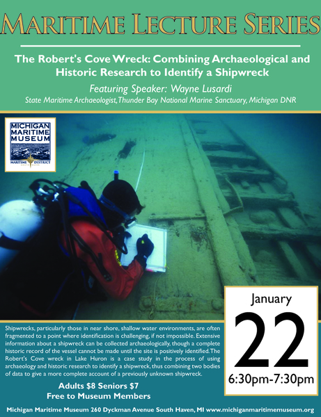 The Michigan Maritime Museum’s Maritime Lecture Series continues with State of Michigan Maritime Archaeologist Wayne Lusardi on January 22nd from 6:30pm-7:30pm and his presentation “The Robert’s Cove Wreck: Combining Archaeological and Historic Research to Identify a Shipwreck.” Museum... read more