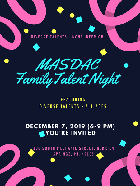 You are invited. This will be a Family Talent Night for all ages. Dec. 7, 2019, from 6–9 p.m. You do not want to miss. Location: MASDAC, 300 South Mechanic Street, Berrien Springs, MI 49103... read more