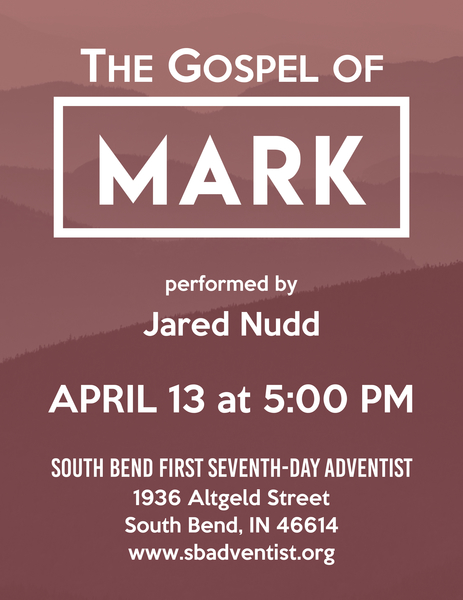 A staged storytelling of the entire Gospel of Mark returns to the South Bend First SDA Church on Sabbath, April 13, at 5 p.m. Save the date and invite your friends and family to experience the thrilling story... read more