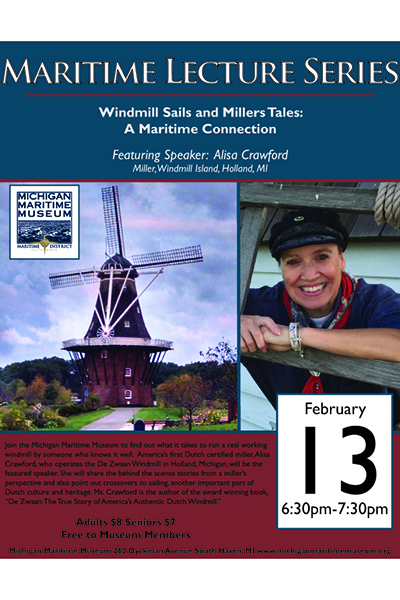 The Michigan Maritime Museum’s Maritime Lecture Series will continue February 13, featuring presenter Alisa Crawford, America’s first Dutch certified miller, who operates the De Zwaan Windmill in Holland, Michigan. Find out what it takes to run a real...