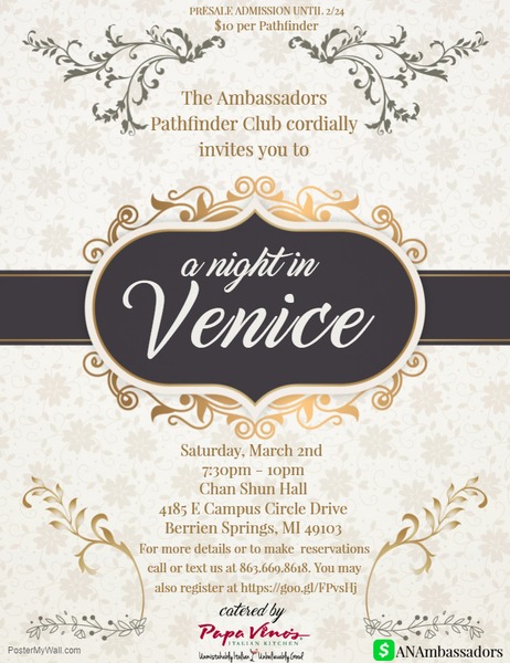 Buon pomeriggio, The All Nations Ambassadors Pathfinder Club would like to cordially invite you to "A Night In Venice" on Saturday, March 2, at 5:45 p.m. in Chan Shun... read moreMichiana Adventist Forum: February 23