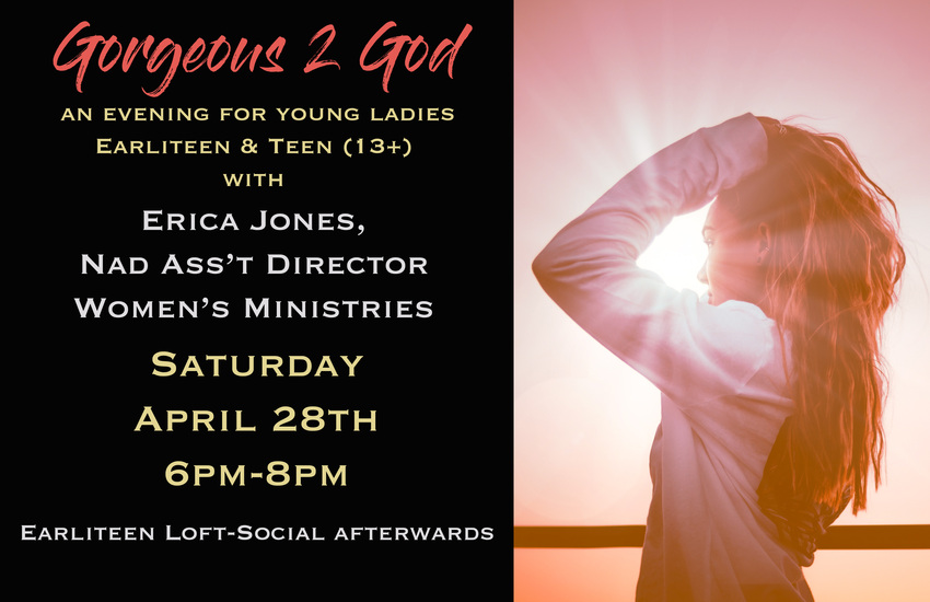 Erica Jones, the NAD assistant Women's Ministries director, is coming to the PMC Earliteen Loft to speak exclusively to our young ladies age 13 and above! This event takes place Saturday, April 28, from 6–8 p.m. followed by...