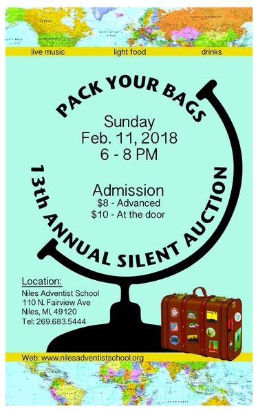 The 13th Annual Silent Auction will take place on Sunday, Feb. 11, from 6–8 p.m. at the Niles Adventist School (110 N Fairview, Niles, MI) . You are invited to come and enjoy appetizers and live music by...