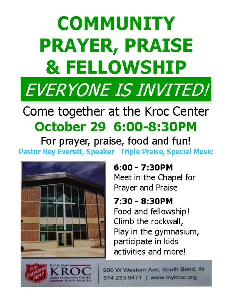 Come together Sunday, Oct. 29, at the Kroc Center in South Bend, Indiana, for community prayer, praise and fellowship. 6–7:30 p.m.: Meet in the chapel for prayer and praise ... read more