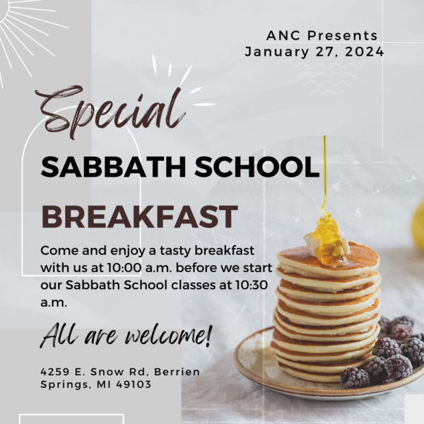 Join us for Sabbath School breakfast on Saturday, Jan. 27, at the All Nations SDA Church. This is an opportunity to meet new friends, enjoy delicious food and learn more about God's word. The breakfast will start at...