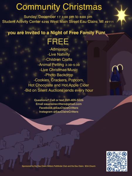 Come experience a celebration of Christ's birth from 3–6 p.m. on Sunday, Dec. 17, at the Student Activity Center in downtown Eau Claire located at 6295 West Main Street, Eau Claire, MI. The event features a FREE Live... read moreDowagiac SDA Church Service, Dec. 16