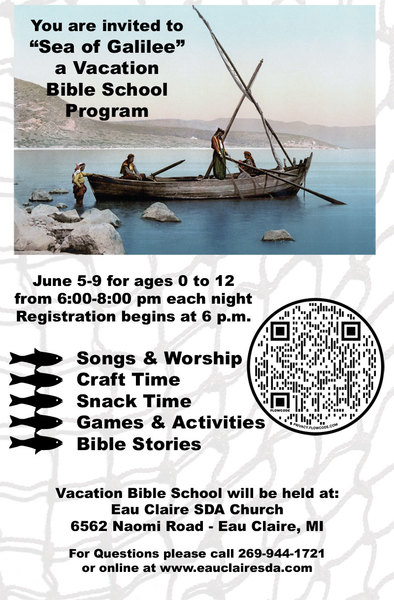 WHAT: You are Invited to the "Sea of Galilee" for a Vacation Bible School Program for ages 0–12. WHEN: June 5–9, from 6–8 p.m. each night WHERE: Eau Claire SDA...