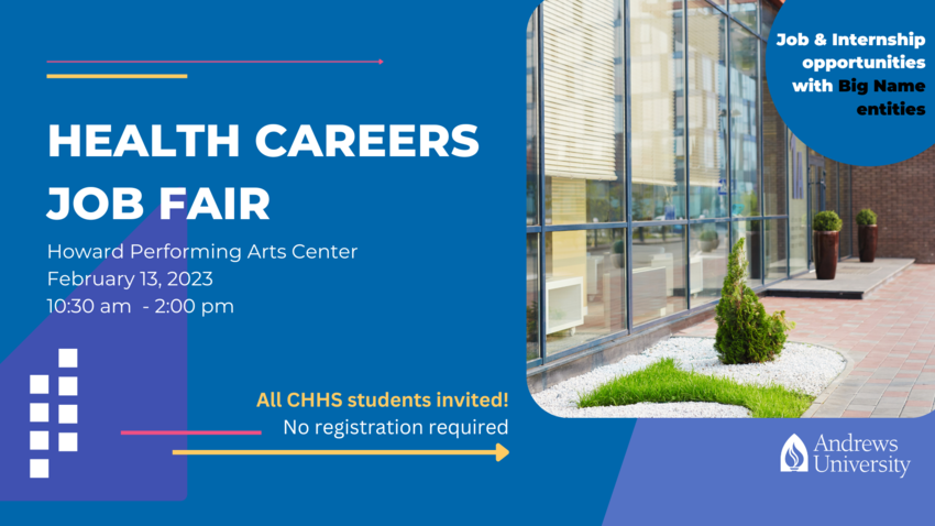Andrews University is pleased to announce its Spring 2023 Health Careers Job Fair hosted by the College of Health & Human Services. It will be held on Monday, Feb. 13, 2023, from 10:30 a.m.–2 p.m. at the Howard Performing... read more