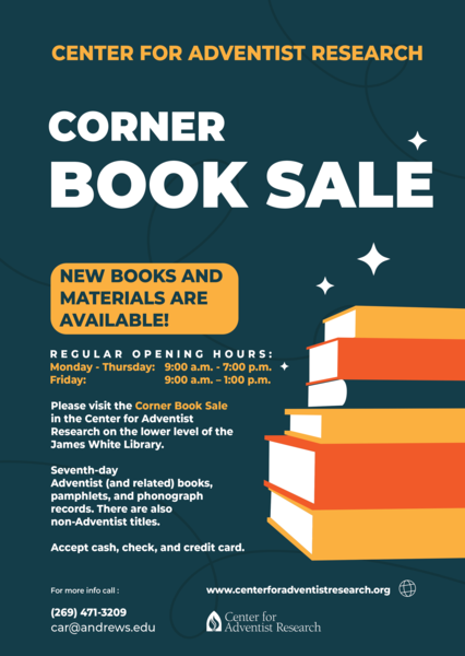 New books and materials are available at the Corner Book Sale in the Center for Adventist Research! The book sale begins on Jan. 22 with hundreds of used Seventh-day Adventist books, pamphlets, periodicals, audio-visuals and Ellen White books... read more