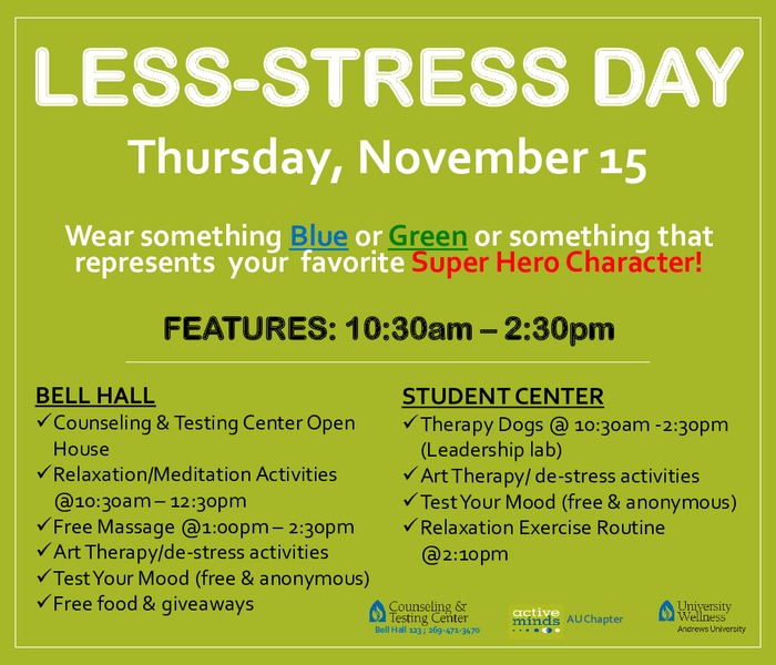 Thursday, Nov. 15, is Less-Stress Day. Wear something blue or green or something that represents your favorite superhero character. Stop by the Counseling & Testing Center (Bell Hall 123) or the Campus Center to particpate in our de-stress... read more