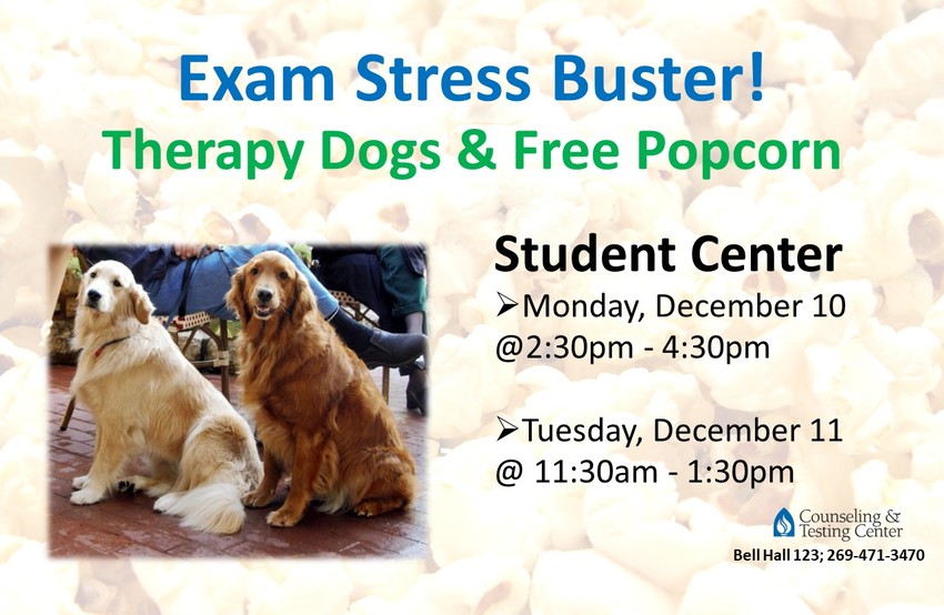 Stop by the Campus Center to de-stress and unwind with therapy dogs and free popcorn.