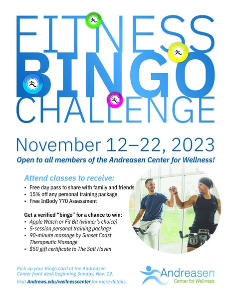 Fitness Class Bingo Challenge Andreasen Center for Wellness, Sept. 29–Oct. 4 Attend group fitness classes all week to acheive as many "bingos" as possible for your chance to win awesome prizes such as life... read more
