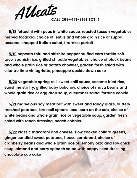 Sabbath lunch made easy.  Please call 269-471-3161, ext. 1, Monday–Thursday from 10 a.m.–4 p.m. Pickup/curbside on Friday from 12–4 p.m. Cost is $7.95 per meal. ... read more