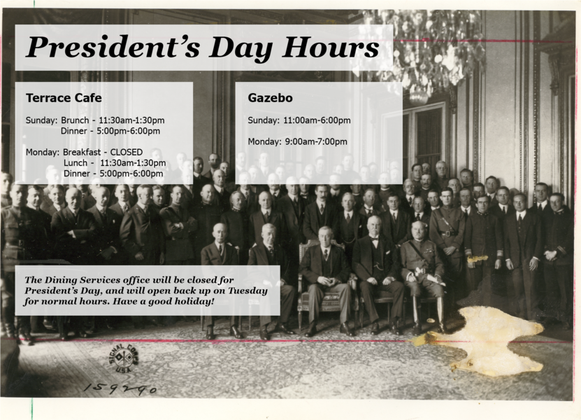On February 17 and 18, Dining Services hours will be changed, in honor of President's Day, to the following:   Terrace Cafe Sunday: 11:30 a.m.–1:30 p.m.... read more