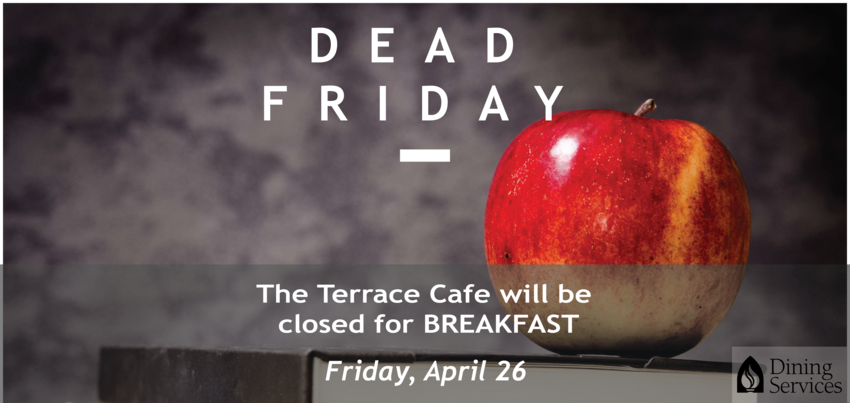 This April 26 is "Dead Friday," which means no classes! The Terrace Cafe will be closed for breakfast—all other times will run regularly.