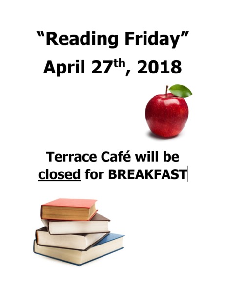 Terrace Cafe will be closed for BREAKFAST on "Reading Friday," April 27, 2018.