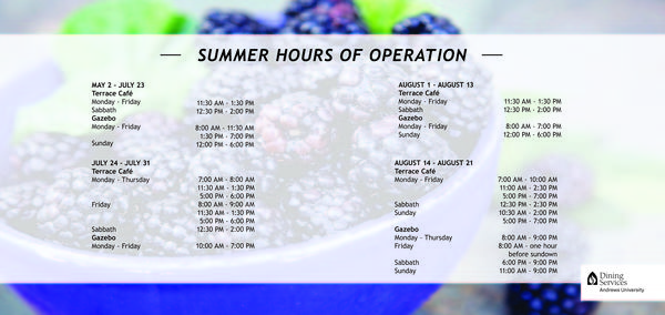 Dining Services Hours Memorial Day Moday, May 30th Gazebo will be open 9:00 a.m. - 7:00 p.m. Terrace Cafe and Office will... read more