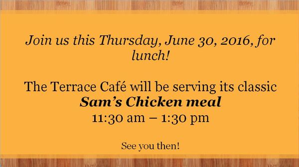 Join us for our famous Sam's Chicken, served with Smashed Potatoes with Gravy, GarlicGreen Beans, an Sweet Corn  in the Terrace Cafe on Thursday, August 25, 2016, from 11:00 am - 2:30 pm.