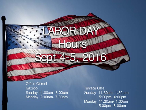 *Office Closed* *Gazebo Hours* Sunday- 11:00am-6:00pm Monday- 9:00am-7:00pm *Terrace Cafe Hours* Sunday- 11:30am-1:30pm                5:00pm-6:00pm... read more