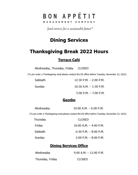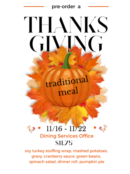 Pre-orders can be placed starting on Wednesday, Nov. 16, through 12 noon on Tuesday, Nov. 22, by contacting Dining Services at 269-471-3161. Orders can be picked up on Wednesday from 1–5 p.m.