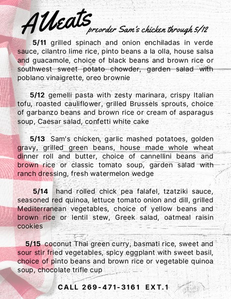 AU Eats Menu for May 4–8, 2020. To place your order, please call 269-471-3161, option 1, between the hours of 8 a.m. and 10 a.m., Monday–Friday.