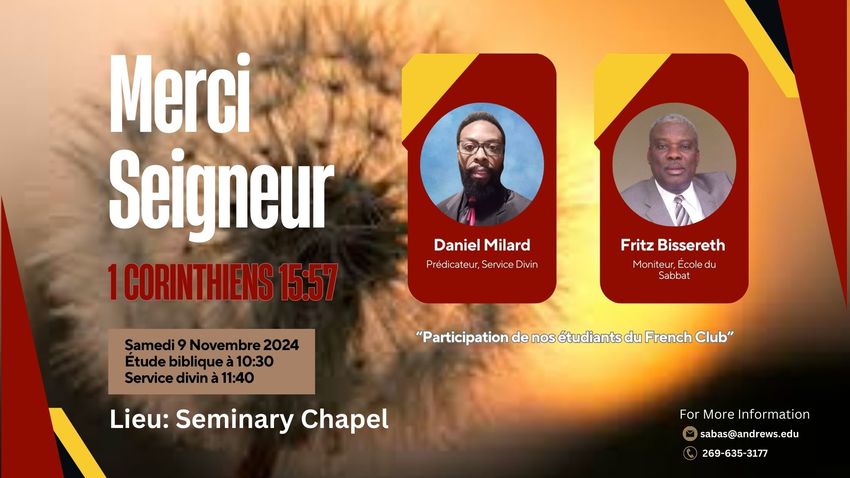 Sabbath School will be at 10:30 a.m. with Joseph Muhune in the Seminary chapel.