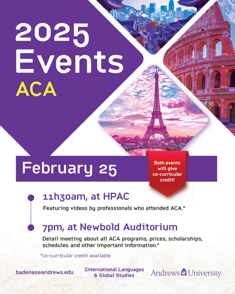 Adventist Colleges Abroad (ACA) will be visiting Andrews University from Feb. 23–25 to share exciting opportunities for students to study abroad and immerse themselves in new cultures. Key Events: ... read more