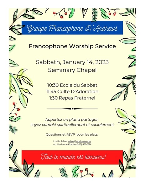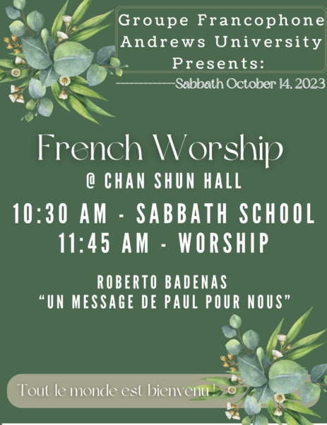 École du Sabbat à 10h30 Culte à 11h45 "Un message de Paul pour nous" Invité Special: Roberto Badenas Restez avec nous pour le repas fraternel. Venez...