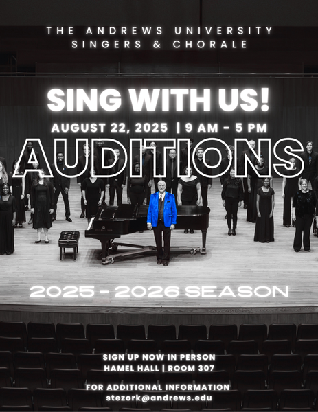 Sing With Us! Andrews University Singers & Chorale 2025–2026 Celebrate 35 years of choral singing under the leadership of Stephen Zork. Live auditions begin Aug. 22, from 9 a.m.–5 p.m., in Hamel Hall. Sign... read more