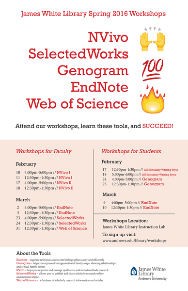 Come learn how to create bibliographies and organize references easily and efficiently for your research. You are welcome to bring your laptop if you like. This is hands-on workshop.