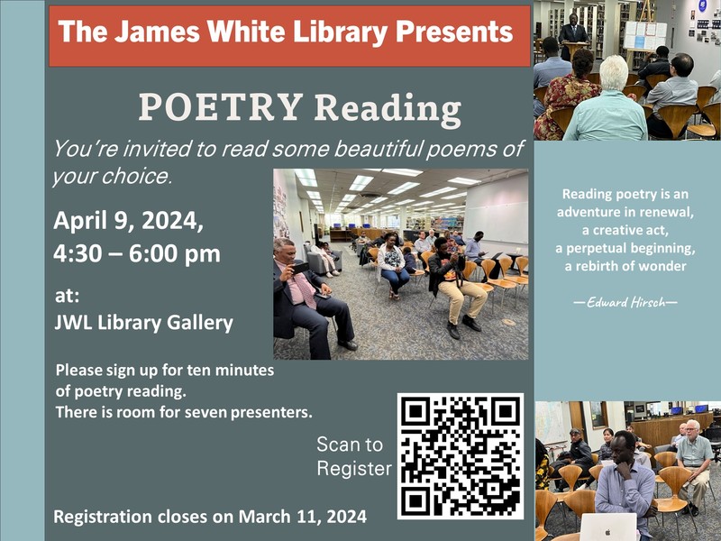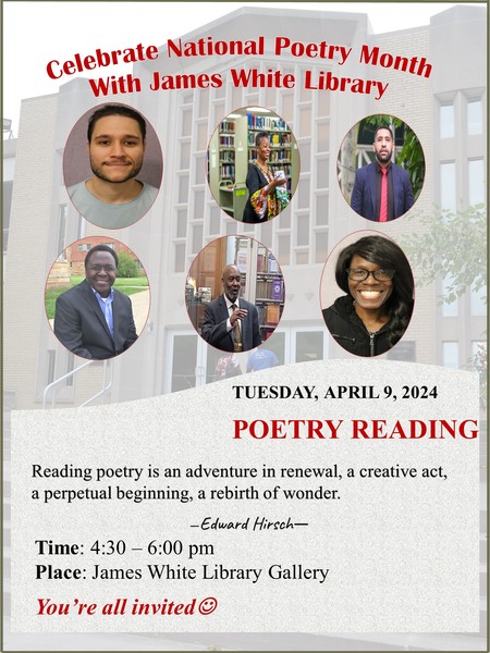 Join us on April 9, 2024, from 4:30–6:30 p.m. at James White Library to celebrate National Poetry Month.
