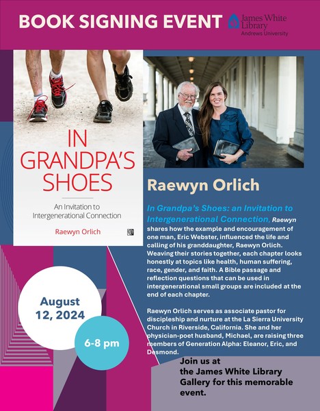 Pastor Raewyn Orlich has written a book about her grandfather, Pastor Eric Webster. Please join us in the launching of this memorable book at the James White Library Gallery on Aug. 12, 2024, from 6–8 p.m.