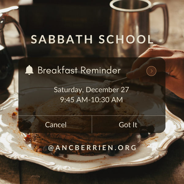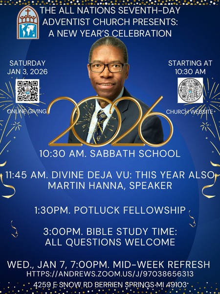 Join us for our New Year's Celebration at the All Nations SDA Church this Saturday, January 3, at 11:45 am, as Martin Hanna presents "Divine Deja Vu: This Year Also." Adult and Children's Sabbath School begins at 10:30...