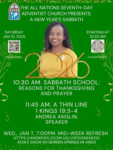 Join us for our worship experience at the All Nations SDA Church this Saturday, January 10, at 11:45 am, as Andrea Anglin presents "A Thin Line." Adult and Children's Sabbath School begins at 10:30 am. We look forward...