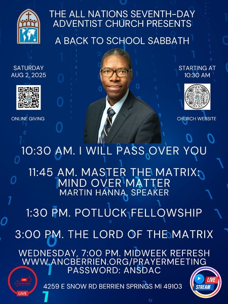 Join us for our worship experience this Sabbath, August 2, at 11:45 am, as Martin Hanna presents "Master the Matrix: Mind Over Matter." Adult and Children's Sabbath School begins at 10:30 am. We will have lunch at 1:30... read more