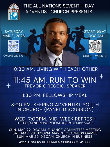 Join us for our worship experience at the All Nations SDA Church this Saturday, March 21, at 11:45 am, as Trevor O'Reggio presents "Run to Win." Adult and Children's Sabbath School begins at 10:30 am. We will have... read more