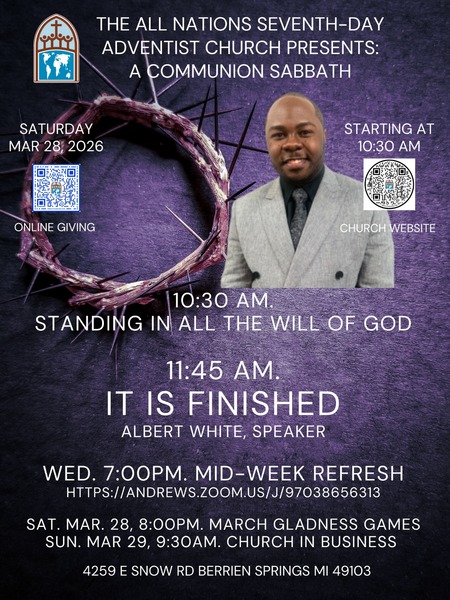 Join us for our Communion Service at the All Nations SDA Church, this Saturday, March 28, at 11:45 am, as Albert White presents "It is Finished." Adult and Children's Sabbath School begins at 10:30 am. We will have... read more